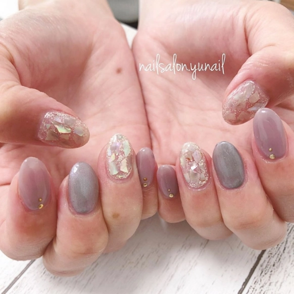 淡いくすみカラーと大きめシェルを埋め込んだこちらの夏ネイル。キラキラ感とつやつや感がとっても夏らしい印象です。夏のスモーキーネイルは重たくならないように、淡めの色をチョイスして、つや感を出すのがポイント☆