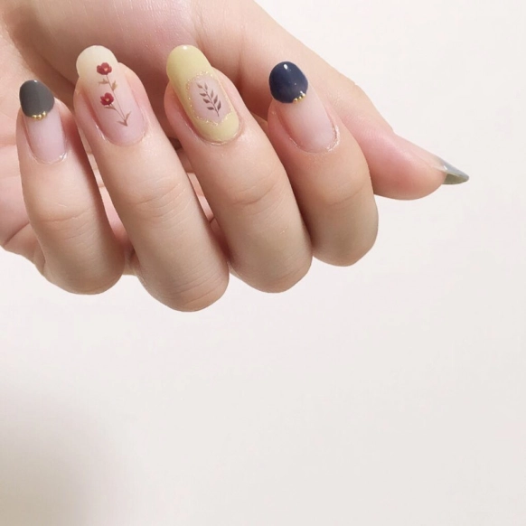 複数のカラーとデザインが盛り込まれていますが、とっても落ち着いた印象に見えるこちらのスモーキーネイル。選ぶカラーを全部くすみカラー&トーンの低いカラーで統一しているからシックにまとまっていますよね。お花デザインでも、選ぶチョイス次第でこんなに秋らしい印象になるんですね☆