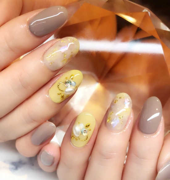 スモーキーなグレーと、春らしいイパステルエローを組み合わせたデザイン。くすんだ色と明るい色のコントラストがオシャレですね!埋め込んだシェルやビジューも春らしさを感じさせます。