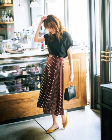 こちらも白いドットのデザインで、重たさを感じないダークブラウンのスカート。サイドの繊細なプリーツが、エレガントさをプラスしてくれています。ブラック×ダークブラウンでも、明るめな靴やドット柄のおかげでフレッシュな印象に!