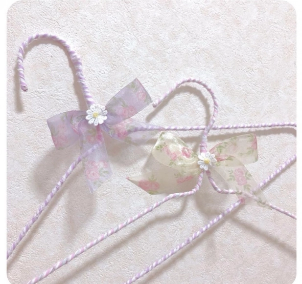 こちらのハンガーは布でリメイクしたもの。パープルとホワイトのツイストがキュートですね。ハンガーの中央にはロマンティックな花柄のリボンと、刺繍の花を飾っておしゃれ度アップ!クローゼットの中に掛けておくにはもったいない、かわいすぎるハンガーです♡