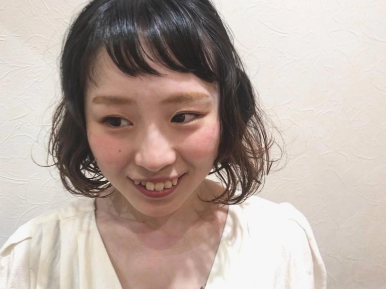 ボブヘアもオン眉と相性抜群。ボブはヘアアレンジもできる長さなので、日常的に髪の毛をまとめたい人にもおすすめです。こちらは、ボブヘアに軽くパーマで動きをつけて外国人風にまとめたスタイル。このように、ボブのオン眉ヘアはパーマをかけても楽しめます。<メイクのポイント!>ヘアカラーより明るめにした眉毛と範囲を少し広めに塗ったかわいめチークが、メイクのポイント。黒髪で少し重たく見えてしまいがちなオン眉ボブを、軽めのメイクでバランスをとった上級スタイルです。リップをあえてつけないことで、派手になりすぎず絶妙なバランスになっています。