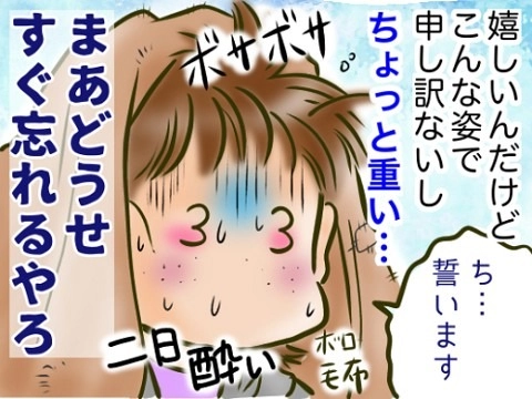 寝起きでボサボサ。しかも二日酔い。