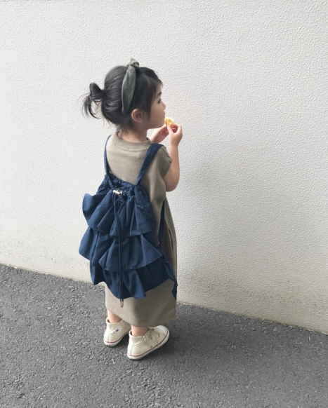 ルーズなスウェットワンピースなら、おしゃれな上に着心地も楽チン!大人がしたいコーデをそのまま子どもに取り入れるのもいいですね。洋服のような大きなフリルをあしらったリュックは思わず目を引くアイテムです。バックスタイルまで気を抜かないのもおしゃれの基本♡