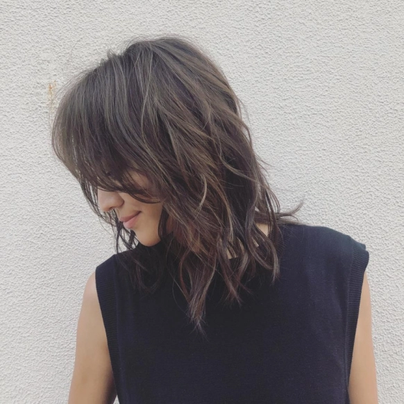 顔回りのゆるやかなレイヤーがフェミニンなこちらのスタイルは、ウルフヘア初心者さんにもおすすめ!かっこいい印象の強いウルフヘアですが、レイヤーの入れ具合でこんなにやわらかな雰囲気に♡センター寄りにバングを分ければ、大人のウルフヘアにもぴったりです。