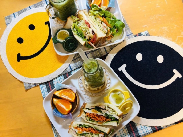 @hiroki_erika_gohanさんは、白のプレート皿に、具たくさんのわんぱくサンドや、グリーンスムージー・果物などをのせ豪華な一皿に。チェックやスマイリーのランチョンマットを合わせることで、かわいらしいテーブルコーデが完成していますよね。