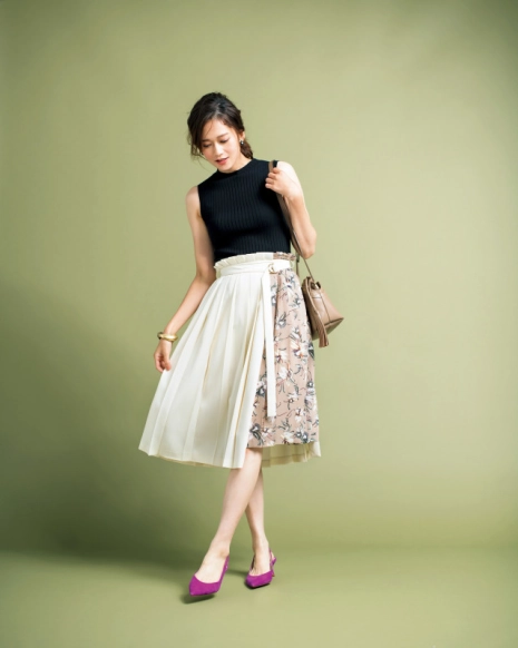 春は、花柄を着たい気分になる人が多いかもしれませんね。白い花柄スカートは薄いカラーのトップスと合わせてもかわいいですが、黒のハイネックと合わせると引き締まって見えます。ノースリーブとの相乗効果で、女性らしい印象に。デートにもぴったりのスタイルです。