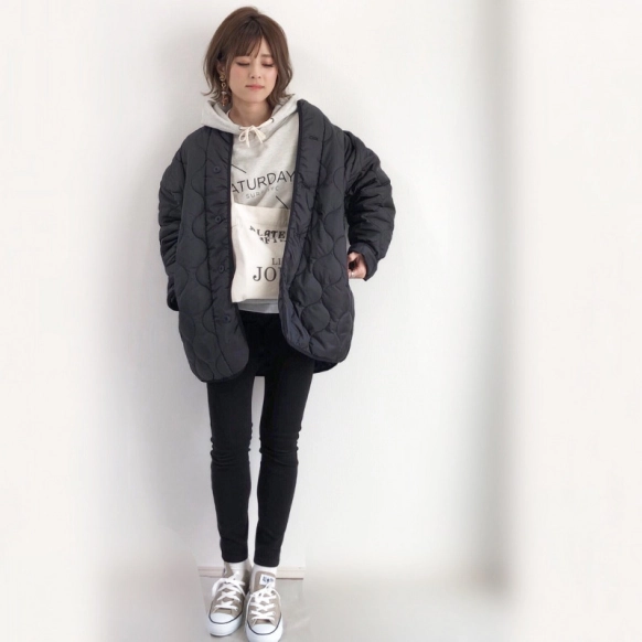 キルティングコートには『GU(ジーユー)』で発売されているもののように、リバーシブルタイプもあります。裏返すとボアコートになるものもあり、コーデの幅が広がるところがメリット。ボアなら裏地としてもあたたかく、裾からチラッと見えたときもおしゃれですね。機能性重視の方は、リバーシブルが狙い目かもしれません。