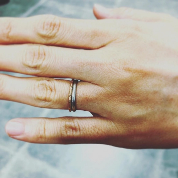 こちらは結婚指輪である『TIFFANY&CO.(ティファニー)』のものと、ファッションリングを重ねづけしたもの。結婚すると毎日指輪をする人も多いかもしれませんが、指輪がいつも同じものだとマンネリを感じてしまいますよね。そんなときは、カラーや細さの異なるファッションリングで、指輪重ねづけを楽しみましょう!シルバーとゴールドの組み合わせもおしゃれです。