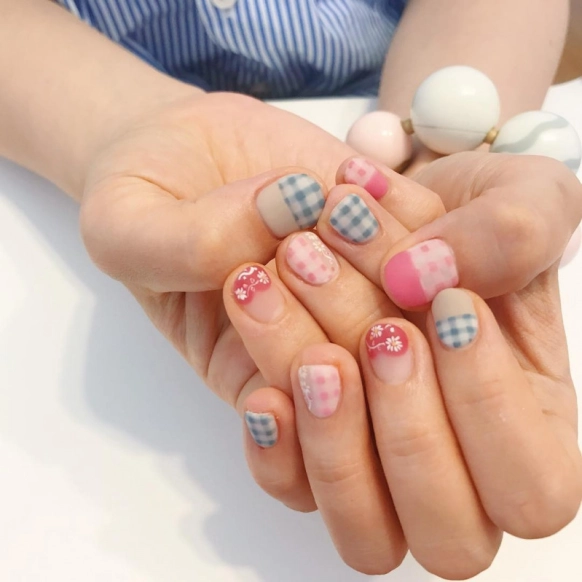 爽やかなピンク×水色のチェック柄を組み合わせたキュートなショートネイルデザインです。かわいらしいデザインが好きという人におすすめ!