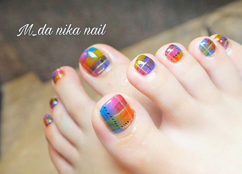 トロピカルでポップなカラーが印象的なマドラスチェックは夏にピッタリ!画像のようにフットネイルとしてチョイスしてもかわいいですよ。