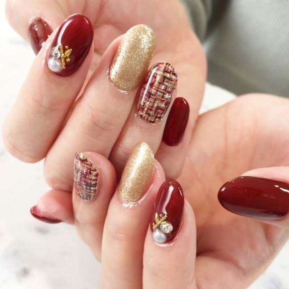落ち着きのあるダーク系のレッドカラー仕上げのツイード風チェックの柄。淡いカラーと比較すると大人っぽい印象を与えてくれるでしょう。レッド×ゴールドはクリスマスシーズンにもおすすめです。