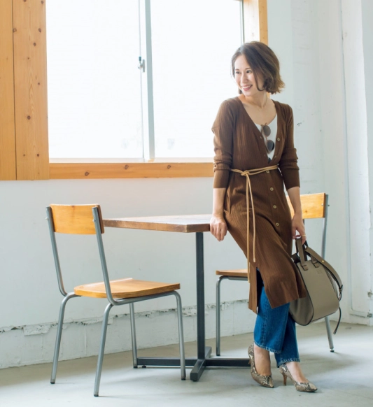 パンプスにパイソン柄を取り入れた、クールな大人女子コーデです。ロングカーデが縦ラインを生み出し、スタイルアップ効果を演出。さらに高めのヒールのパンプスを合わせることですらりと脚長に見せることができます。またカーデやバッグのブラウンカラーとパンプスのカラーがリンクし、秋冬らしい印象に。クールな雰囲気のなかにもどこか色っぽさを感じられるコーディネートです。