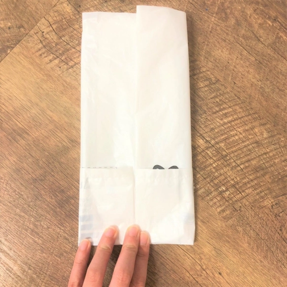 では、ポリ袋のたたみ方をご紹介していきます!今回は、持ち手のない袋で実演しますが、持ち手があるポリ袋も同じ手順で進めていきますよ。無印のケースやティッシュ箱にも収納できるサイズにたためるのが、こちらの方法です。まずは、袋を裏返しにします。シワをピンと伸ばすと、たたみやすいですよ。そして、1/4ほどを裏側に折り込みます。