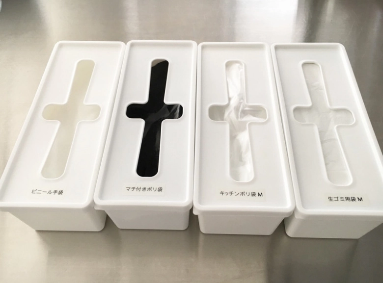 こちらもセリアアイテム。長方形のボックスにポリ袋を入れ込むアイテムで、ふたに十字の切り込みが入っています。これを使って、ポリ袋が取り出せる仕組みになっているのだそう。このアイテムはSNS人気が高く、活用している人も多いそう!@qu_miiiiiiiさんは、このボックスにラベリングを施して袋の種類分けをしていました。こうすると、さらに使い勝手がよくなりそう◎。さっそくマネしたくなるアイデアです。