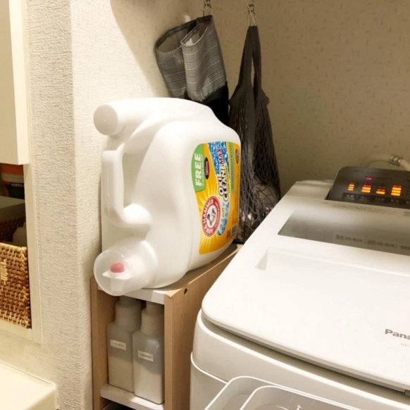 こちらは@a_sami.homeさんが先ほど紹介した洗濯用洗剤「ステインファイターマックス」を使用している写真です。このようにオキシクリーンのボトルを寝かせて設置します。洗剤を使うときは、カップを取り、赤いボタンを押すと洗剤が出てきます。容量は水量73Lに対してカップの2目盛り(46mL)です。とってもお手軽ですね!「ステインファイターマックス」を使うのもよいかもしれませんね!