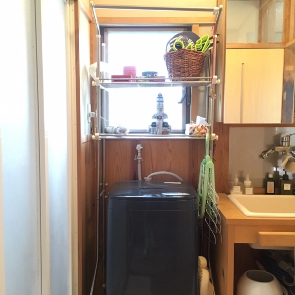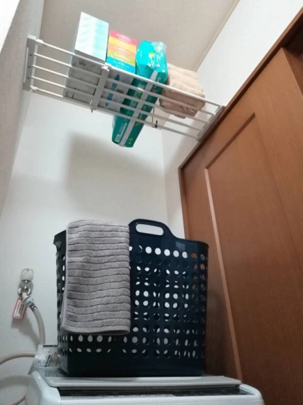 洗濯機スペースの幅が狭ければ、つっぱり棒でもラックを作れます。こちらは1本のつっぱり棒でスプレーボトルやタオルをひっかけていますが、2本組み合わせれば真ん中にかごを置けたり、上に板を乗せて簡易的な台を作れたりと、工夫次第でとても使いやすく便利な洗濯機ラックができますよ。