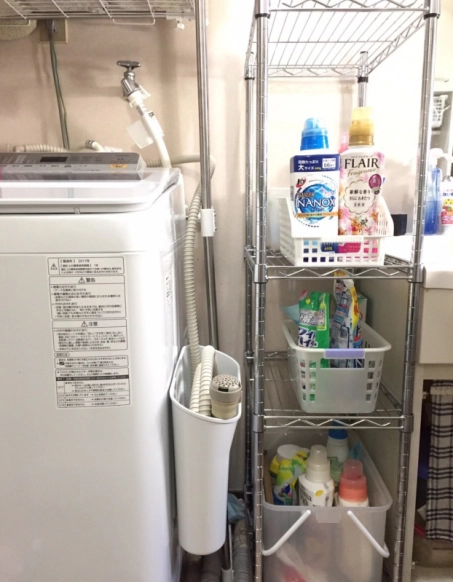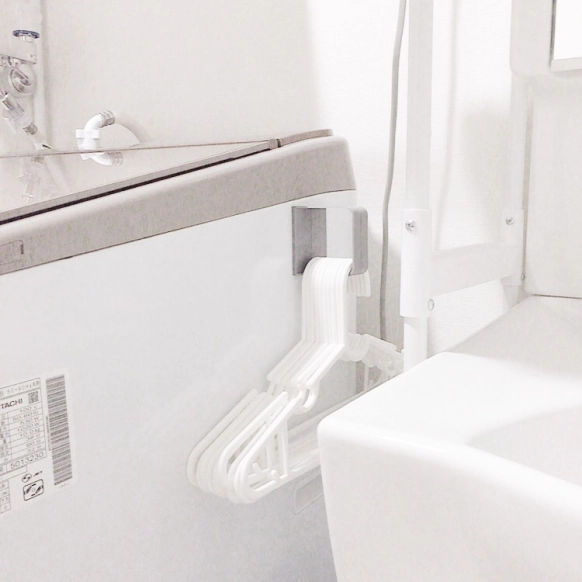 洗濯機ラックを置くスペースが全くない人は、洗濯機に直接収納グッズをつけるのがおすすめです。こちらはハンガーをかけていますが、マグネットやシール式のフックでかごをひっかけると洗剤や柔軟剤ボトル、洗濯ネットなどを収納できますよ。