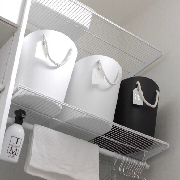 こちらはつっぱり板で収納スペースを作っています。組み立てる必要がなく取り入れやすいでしょう。つっぱり棒は、リーズナブルな価格で手に入り、場所によって長さを変えたり用途に合わせて位置を変えたりできるというメリットが。また、S字フックを使えば、ハンガーやネットをひっかけて使うことも可能です。耐荷重はつっぱり棒によって変わるので、重たいものを乗せたり引っかけたりして使う場合は、どのくらいの重さに耐えられるかということをしっかりチェックしてくださいね。
