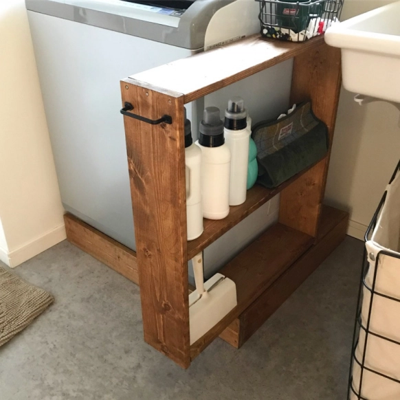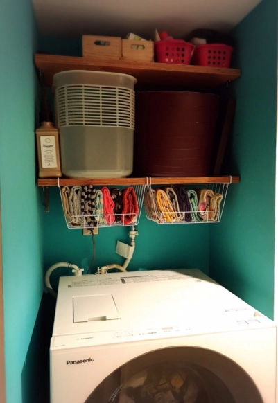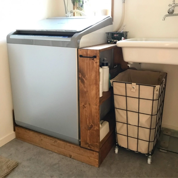 こちらの洗濯機ラックはDIYのオリジナル。洗面所と洗濯機のすき間を有効活用したいけど、なかなかサイズが合うものがないという人もいますよね。DIYだと幅や奥行き、高さなどぴったりのものを作れます。洗濯機ラックといっしょに、生活感がでてしまう防水バンを隠すという工夫も。