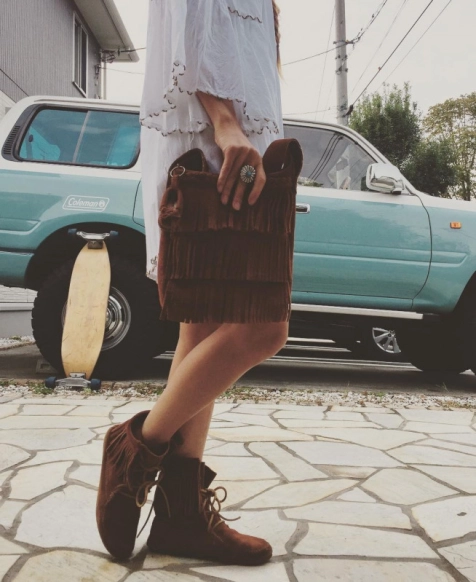 アクセサリーやバッグ、ヘアスタイルもエスニック風に統一して、フリンジブーツの魅力を最大限活かしたコーデに♡