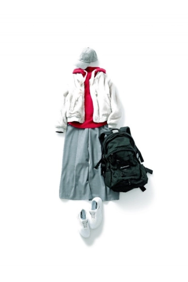 寒い季節にはあったかアウターが大活躍。こちらは、ボリューム感たっぷりのボアアウターを使ったスポーツミックスコーデです。トップにボリュームを持ってきたら、ボトムはブラックカラーを使ってすっきりと引き締めを。足元にスポーツシューズを合わせたら、カジュアルスポーツミックスコーデが完成します。