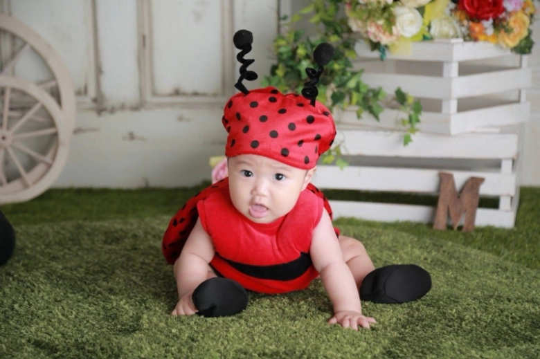 ねんね期~お座り期のベビーには、着ぐるみ系がおすすめ!コロンとしたフォルムのこの時期に着ぐるみ系のコスプレ服をまとえば、まるでぬいぐるみのように見えますよ。着ぐるみはいろいろな種類がありますが、かわいいイメージの動物やカラフルなカラーの虫を選べば女の子らしくなりますよ。こちらの写真のように赤を基調としたてんとう虫なら、女の子のかわいさを前面に出すことができるでしょう。