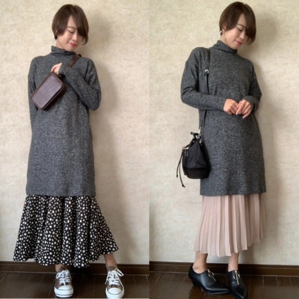 1枚で着ると少し短めのソフトニットフリースワンピース。丈が短いかも…と思う人は@rinachishimaさんのように、ロングスカートとレイヤードするのがおすすめ♡カジュアルな印象のニットワンピが、一気に大人の女性らしいコーデに。手持ちにロングスカートがあれば、すぐに真似できるおすすめコーデです。