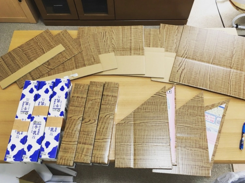 まずは、設計図に合わせて牛乳パックを切ったり、段ボールを貼り合わせたりします。それぞれのパーツを作ったり貼り合わせて乾くまで待ったりと時間がかかりますが、置きたいスペースに合わせた大きさのものを作れるのがメリットです。