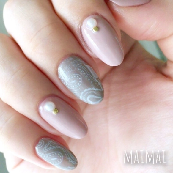先ほども紹介した7弾目のベーシックには、手書きだと難しいペイズリー柄もあります。スモーキーなグレーカラーにペイズリーをスタンピングして、残りの爪は同じくスモーキーな色味のピンクを配色することで大人かわいい仕上がりに♡ちょっと派手に仕上げたいという場合は、POPな色味やミラーネイルを取り入れるのもアリですよ!