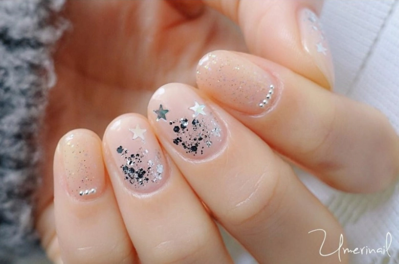 星パーツを使用するとかわいくなりすぎることがありますが、カラーレスなネイルにすることで大人っぽく仕上がっていますね。