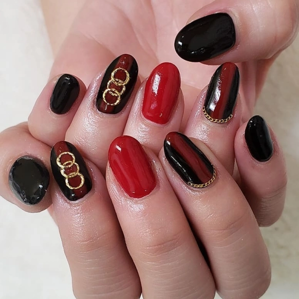 相性の良い黒と赤の組み合わせ。セクシーな印象を感じさせ、大人の女性らしさ満載です。@yuu.1457さんは、赤と黒、ポイントにゴールドカラーを入れた高級感溢れるデザインをされています。パっと見て目につきやすく、「他の人とかぶりたくない!」という人にもおすすめのネイルデザインです♡