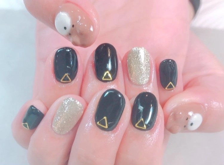 黒のベタ塗りに金のパーツを組み合わせた@hiromi.nailさんのネイルデザイン。大人っぽい印象が感じられますよね。他の指はポイントに金のラメを入れ重くなりすぎないようにされています。さらに両親指には3Dのクマちゃんが♡クマなどのキャラクターを入れると子どもっぽくなりそうですが、他の指は黒や金と落ち着いたカラーを使用しているので、子どもっぽさを防いでくれます!周りからも注目が集まりそうですね♡