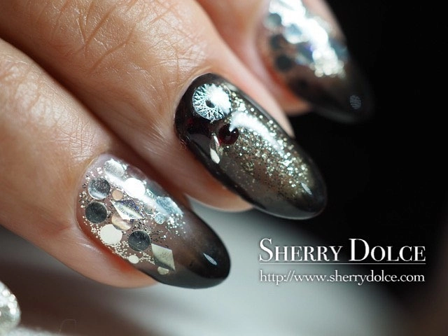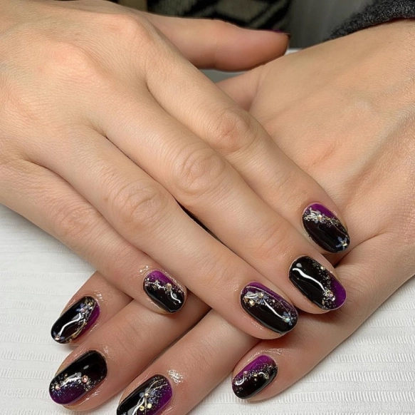 透明感ある黒のグラデーションが美しい@sherrydolce_rikaさんの黒ネイルは、ラメとホロの輝きをプラスしてエレガントな印象に。魔女感のある黒はグラデーションにすることでキツい印象をうすめてくれるので、サロンなどでオーダーするときは覚えておくとよいですよ。