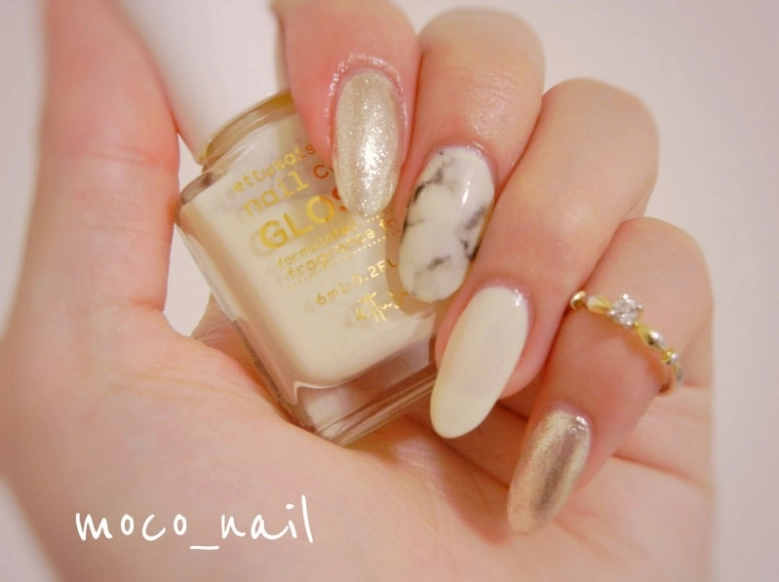 高級感漂うこちらの大理石調のネイルは、ネールカラーa シリーズのオフホワイトと100円ショップのネイルシールを組み合わせて作ったものだそう。大理石部分は、オフホワイトネイルの上にシールを貼っただけのお手軽さ。エテュセネイルのオフホワイトが白浮きせず、高級感を出せるカラーだからこそ成せたデザインかもしれませんね☆