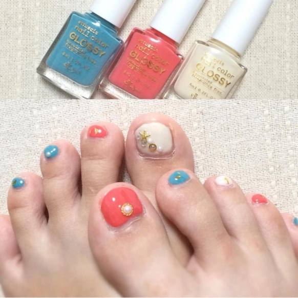 こちらのカラフルなフットネイルは、エテュセのネールカラーa シリーズを3色使ったデザインフットネイル。シリーズのカラーはそれぞれ相性が良いので、バラバラのカラーなのに塗るだけでアラビアン調の素敵なネイルになるから不思議♡@booparadise_insta さんは、ネイルシールでさらにデザイン度をアップ!簡単なのにとってもかわいくて、配色のセンスもうかがえる素敵なフットネイルですね。