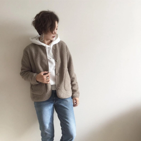 パーカー×デニムのカジュアルなコーデも、ベージュのボアブルゾンをプラスすることで女性らしい着こなしに。シンプルですがトレンド感のある着こなしは、ママのデイリーコーデの参考にしたいですね!