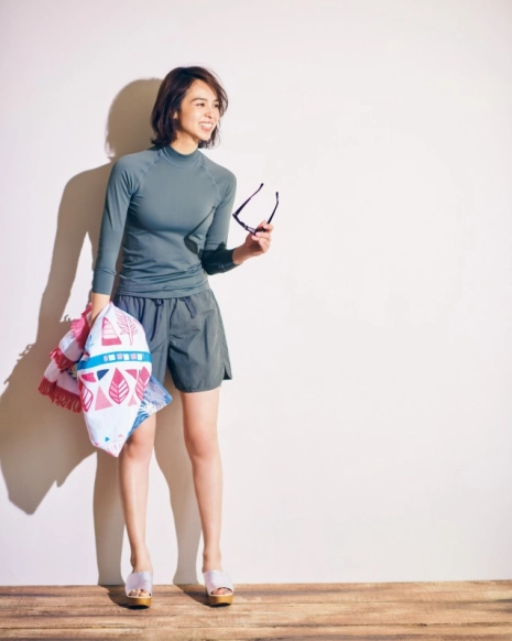 ・ラッシュガード×ショートパンツはワントーンコーデでスッキリと☆