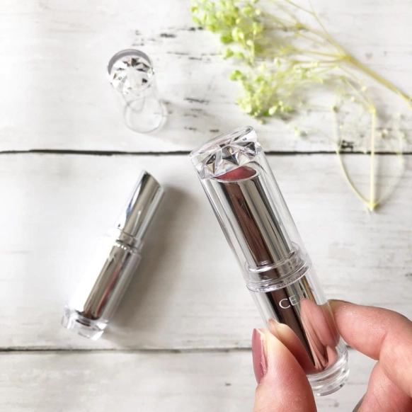 セザンヌのラスティンググロスリップは、その美しい見た目も魅力のひとつ。リップのフタのトップには、キラキラと輝くカットデザインが入っています。シルバーの本体部分も高級感がありますよね。