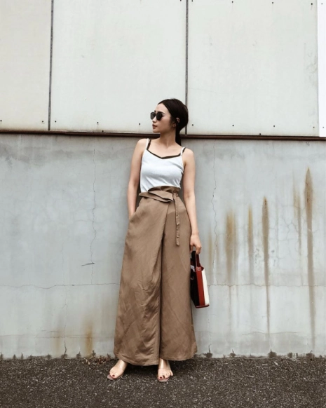 ヌーディーなホワイトキャミソールにベージュのワイドパンツを合わせたシンプルなコーデだからこそ、サングラスでアクセントをプラスするのがおすすめです。全体が無地で落ち着いた印象なので、サングラスをつけるだけで目線が上に上がりスタイルアップ効果も抜群。髪もサッとまとめてスッキリ見せしながら、バッグの赤もさし色になっていてGOODですね。
