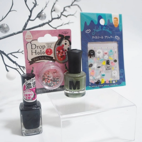 『キャンドゥ』ですべてそろえたという、ハロウィーンネイルのためのグッズたち。ブラックネイルポリッシュも、ハロウィーンネイルをするならそろえておきたいですね。