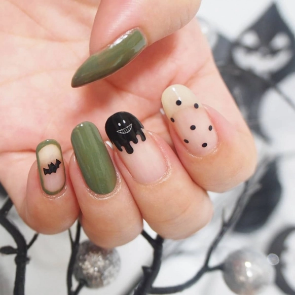 イエローやピンクのおばけシールを使うとキュートなハロウィーンネイルに仕上がりますが、@300yen_codeさんはブラックのおばけのみ使用。大人ハロウィーンにぴったりのネイルですね。小指の囲みネイルもマネしたいアイデア。モードなハロウィーンネイル、ぜひ次のハロウィーンには真似してみてくださいね。