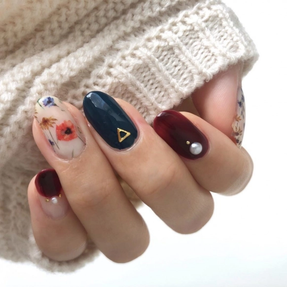 @ mari___haruさんが教えてくれたのは、『Can☆Do(キャンドゥ)』のしずくネイルシールを使った華やかなデザインネイル。シックなカラーで落ち着きがあり、他の指にマッチする、クラシカルなフラワーネイルです。すべての指にお花のシールを貼ってしまうと派手になりすぎますが、1~2本の指に散りばめることでとってもおしゃれにまとまりますね。