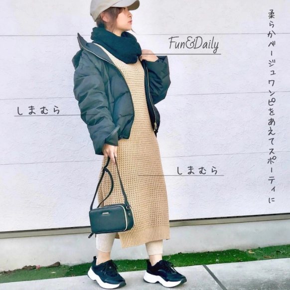 柔らかなカラーのベージュのワンピースをスポーティーな雰囲気で着たコーデです。ダウンジャケットやスヌード、バッグやスニーカーを黒でまとめることでコーデに締まりと統一感が出ますね♡真冬でも着られるおしゃれなコーデです。