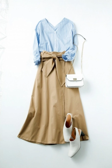 こちらはベージュのチノ素材スカートにストライプ柄のブラウスを合わせた爽やかなコーディネートです。首元のVネックデザインやスカートウェスト部分のリボンデザインでシンプルななかにもフェミニンさをプラス。オフィスカジュアルにも対応できるスタイリングです。