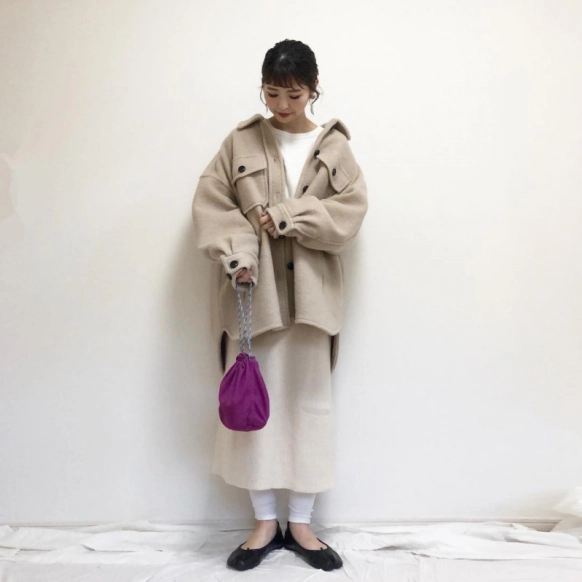 @223.ceさんは、女性らしいニットスカートにあえてメンズライクなオーバーサイズジャケットを合わせることでヌケ感のあるコーデに仕上げています。ニットスカートからは、レイヤードしたレギンスがチラッと見える丈感が◎絶妙なバランスで足首見せすることで細見え効果もアリです。