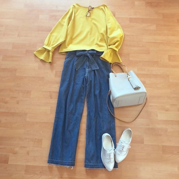 デニムのワイドパンツにパッと明るい黄色のトップスを合わせた@romiiiiina_163さんのコーデ。春夏らしいカラーに、小物はグレーとシルバーで統一されています。トップスで明るい色を使ったら小物で色の引き算をするテクはマネしたいですね。ワイドパンツのウエストリボンと袖のデザインが女性らしく、デートにもおすすめのコーデです。