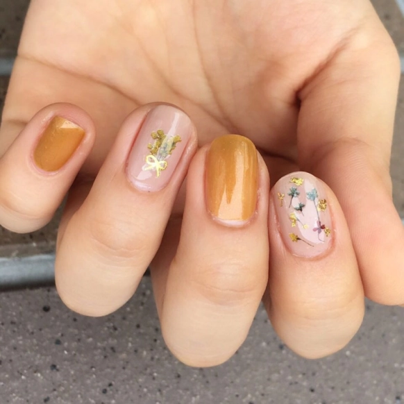 @chaaa_322さんのネイルは、小花のネイルシールにトレンドのマスタードを合わせています。小花柄は春っぽいイメージになりがちですが、落ち葉を思わせるようなマスタードカラーと合わせることで秋らしく仕上がっていますね。マスタードやグレーなどのくすみカラーやスモーキーカラーと合わせると、秋らしい仕上がりになります。