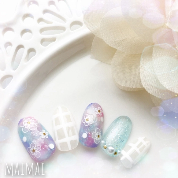 @ selfnail.maimaiさんのネイルは、タイダイ風に仕上げたベースネイルの上にシースルーのフワラーシールを合わせたクリアネイル。白の格子柄との相性も良いですね。水色や白などの涼し気カラーをベースにすれば、暑い夏も乗り切ることができそうな爽やかな夏ネイルになりますよ。