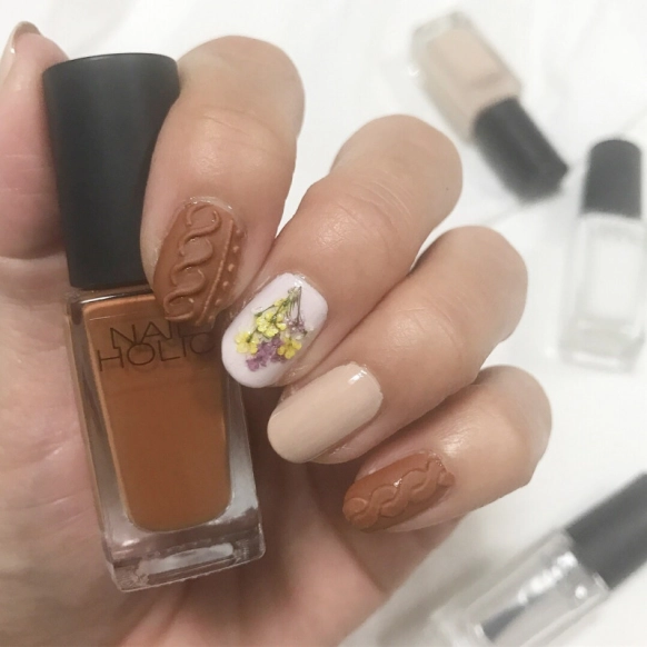 @mika_____akimさんのネイルは、『Seria(セリア)』のドライフラワーパーツと『DAISO(ダイソー)』のニットネイルシールを使用した、押し花ネイルとニットネイルの組み合わせです。ネイルアートやアクセサリー制作にも使えるドライフラワーパーツをベースカラーの上にそのまま載せて、トップコートを塗ります。ニットネイルはシールを貼った上からネイルカラーを重ねています。3Dタイプのパーツやシールを使えば、セルフでも手軽に3Dネイルを楽しむことができますよ。